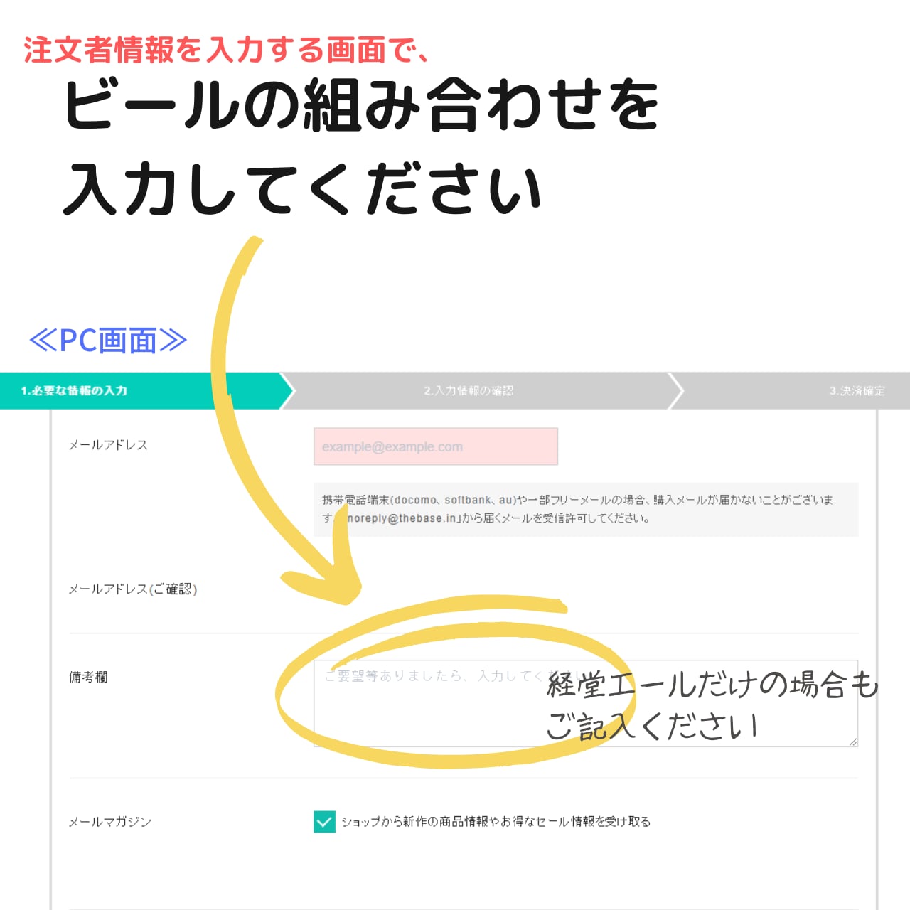 「注文者情報の入力」画面の備考欄で